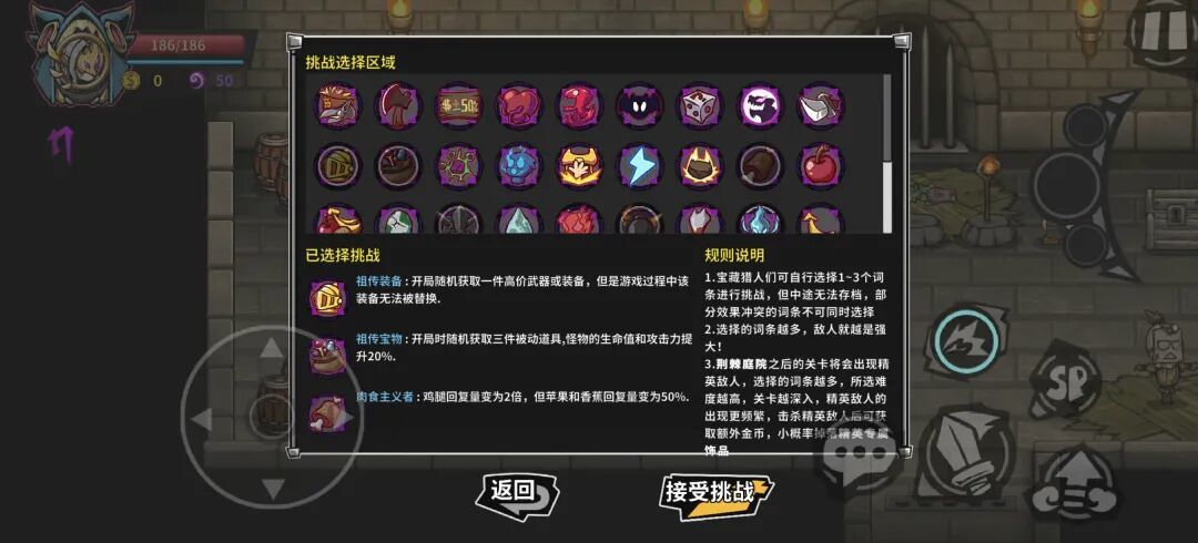 单人自选挑战规则升级!宝藏猎人可以自行选择13个词条进行挑战,荆棘庭院之后的关卡将会出现精英敌人,选择的词条越多,敌人就越是强大!击败精英敌人后可获得额外金币,小概率掉落精英专属饰品哦~