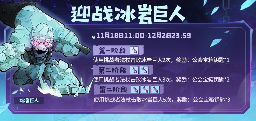 活动期间,使用武器“挑战者法杖”击败第三层首领冰岩巨人达到指定个数,即可获得对应奖励~