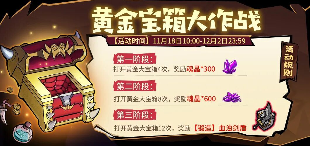 城堡寻宝活动开始啦~活动期间累计打开黄金大宝箱达到指定次数,即可获得对应奖励!