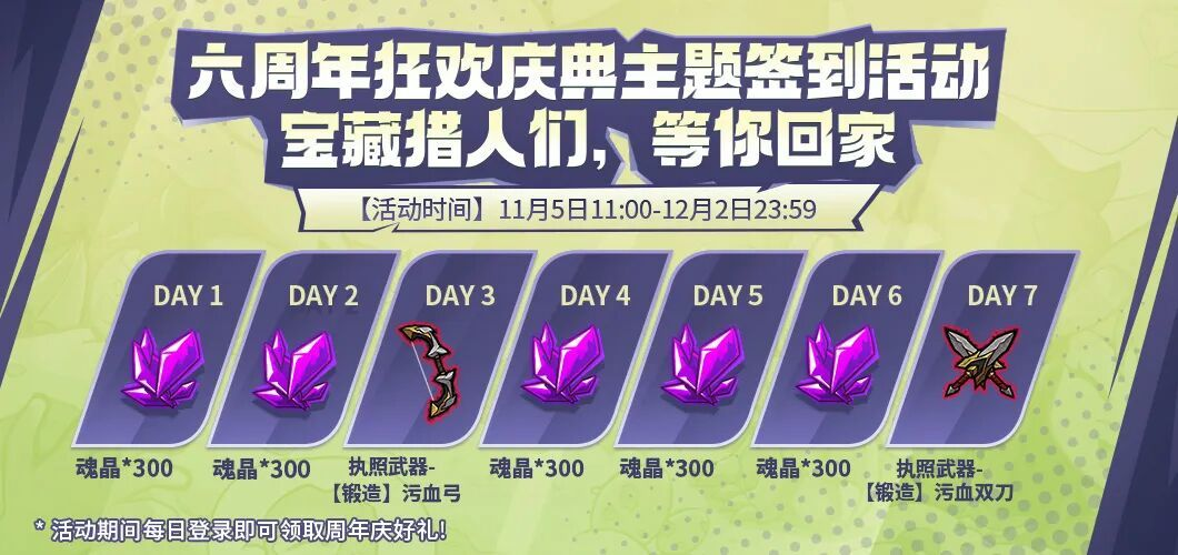 6周年庆大版本已于11月5日上午11:00正式开启!本次周年庆版本不仅有全新BOSS、全新玩法模式来袭,更有全新外观和武器登场!当然,城堡探险必不可少的补给也安排上了!宝藏猎人们完成活动任务即可解锁丰厚的奖励哦~